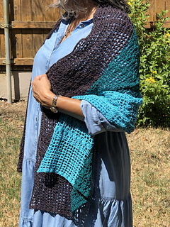 This shawl is made using Red Heart It’s a Wrap yarn (50% acrylic, 50% cotton), a super fine (#1) weight yarn that provides breathability and softness—perfect for transitional weather.
