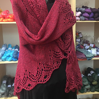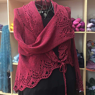 Eine extravagante Strickjacke auf Basis eines Quadrates, glatt rechts gestrickt, dessen Kanten und Ärmel in einer Strickspitze enden.