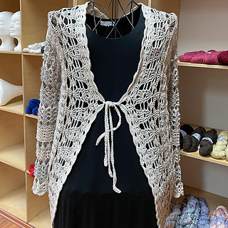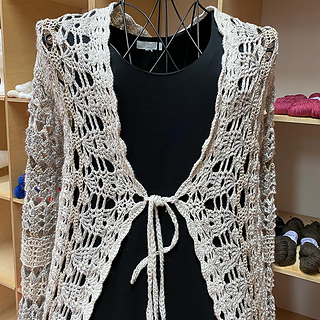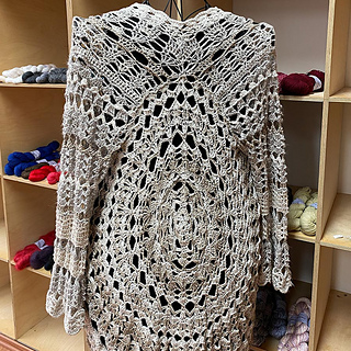 A flower-power style crocheted cardigan in EU women’s size 40 – 42.