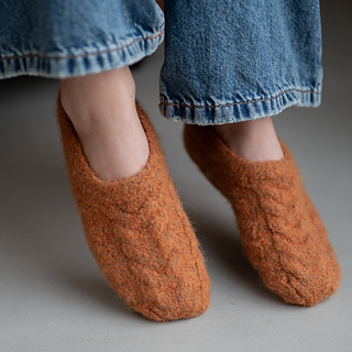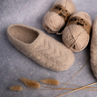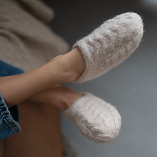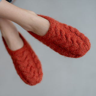 The slippers are knitted in one piece from the ankle down, then felted into a dense, durable fabric that hugs the foot without bulky seams. A clean cable detail runs to the toe for an elegant finish.