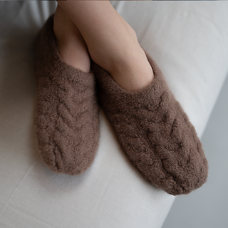 A tailored, one-piece felted slipper knitting pattern with a sculpted fit and elegant cable detail. James Felted