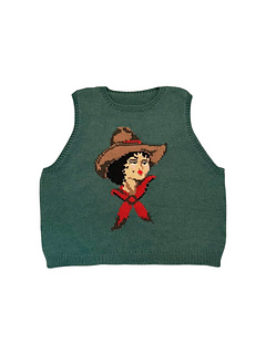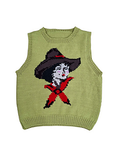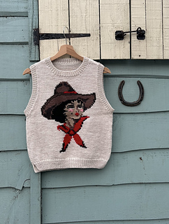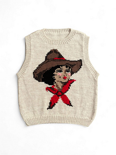 The body of the Jane Vest is knit flat, bottom up. First the front panel is knit using intarsia to create the bulk of the colourwork motif, then duplicate stitch is used to add in the finer details. Secondly the back panel is knit in the main colour. The shoulders are joined using the three needle bind off. The sides are seamed using mattress stitch. Lastly, stitches are picked up around the arm and neck holes and the ribbing is worked in the round.