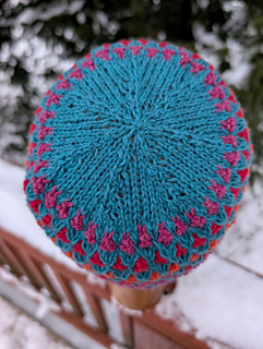 Notes on Colour Choices – This hat could easily be knit with only two colours or scraps of multiple left over colours in the right weight. I had 3 small balls of the pink, red and orange wools that totaled to about 55 grams. I had much more pink wool than any other colour. So, I made up a repeating pattern that allowed for the pink to be predominant.