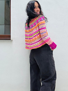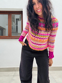Este jersey se teje en redondo. Comenzaremos tejiendo desde el cuello, haciendo un canesú redondo hasta tener el ancho necesario para dividir las piezas en delantero, espalda y mangas, dejando los puntos de las mangas en espera. Tejeremos el cuerpo en redondo y terminaremos tejiendo las dos mangas.