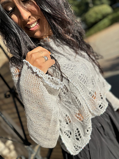 Este jersey se teje en abierto, trabajando un total de cuatro piezas por separado que se unirán entre si con la aguja de ganchillo. Una vez que todas las piezas estén terminadas, recogeremos los puntos para las mangas.