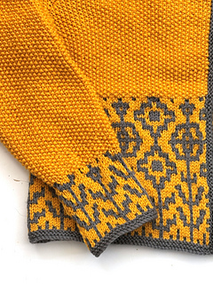 This elegant cardigan is knitted flat, beginning with a garter stitch border on the lower body and sleeve edges, followed by a flower-patterned mosaic band. The rest of the cardigan is knitted in moss stitch. Sandra Nesbitt’s design has set-in sleeves and a gently curved neckline. Once the pieces are seamed, stitches are picked up around the neck and along the front edges and worked in garter stitch for a neat finish.
