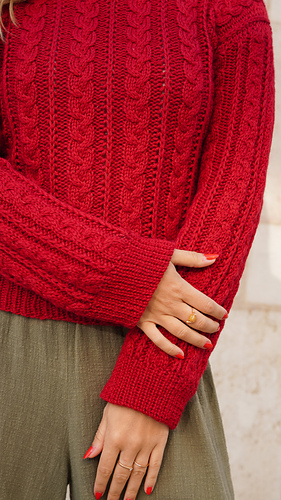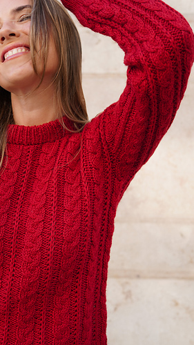 Der Pullover wird nahtlos von unten nach oben gestrickt. Zunächst arbeitest du den Rumpf in Runden, bevor die Arbeit an den Armausschnitten in Vorder- und Rückenteil geteilt wird. Diese werden anschließend in Hin- und Rückreihen fertiggestellt. Ein besonderes Detail sind die Zöpfe, die unter dem Arm nahtlos in die Ärmel übergehen und so eine harmonische Linienführung im gesamten Design schaffen.