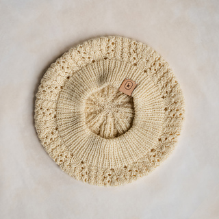 This beret is worked from the top down starting with a traditional i–cord detail and then worked out from the center to the folded brim. The cable and lace details throughout are not too difficult and keep the project engaging!