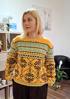 The Jumis Sweater draws its inspiration from the ancient Latvian symbol of Jumis, which represents fertility, abundance, and a bountiful harvest, often depicted as two ears of grain growing together. This symbol is associated with the Baltic deity Jumis, believed to reside in the fields and ensure prosperity. I’ve borrowed this symbol, embellishing and transforming it to fit my vision for a top-down, drop-shoulder, multi-coloured colourwork sweater.