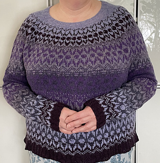 Juxtaposition is worked top-down seamlessly. The sweater has a round yoke and an all-over colorwork pattern. The sweater has long sleeves and no waist shaping. The hem is cropped. Because of the colorwork there’s no bust dart but you can easily lengthen the body of the sweater. You can use a separate MC and CC but the look of the sample was achieved using a gradient, starting MC from the light end and CC from the dark end.