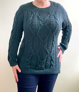 Notes: The sweater is worked top-down, from one shoulder, then flat to end of armhole, before joining and working the body in the round to final bind off. The sleeves are worked top down with short rows for the cap and then worked in the round to final bind off. Both body and sleeves have a fake seam stitch. The neck band is worked at the end. All twisted rib bands end in a tubular bind off.