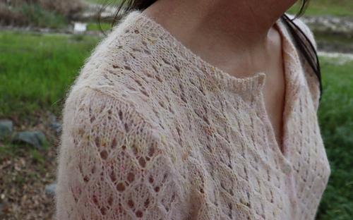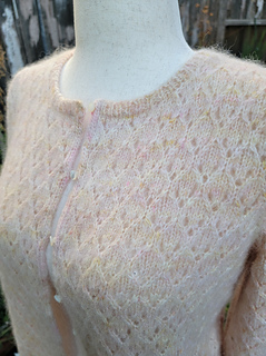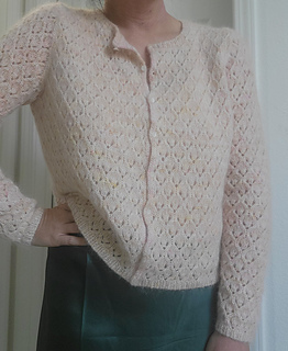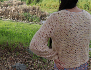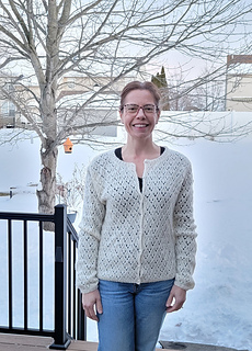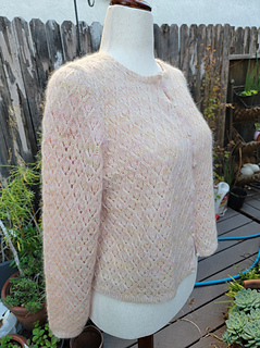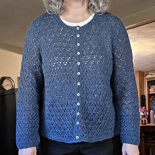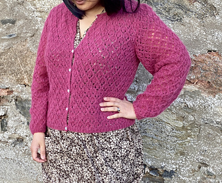 The Kaiyose Cardigan is a lightweight layering piece with an allover lace pattern and soft drape. The minimal ribbing, high neckline, thin button band, and small buttons ensure that the lace is the featured detail. The body and bishop set-in sleeves are knit flat from the bottom up in separate pieces that need to be seamed together and then finished with an i-cord button band.