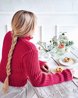 Konstruktion: Tröjan stickas nedifrån och upp med två garnkvaliteter som hålls tillsammans. Först rundstickas bålen i ett stycke, därefter stickas bak- och framstycke var för sig, fram och tillbaka. Ärmarna rundstickas, ärmkullarna formas genom att sticka fram och tillbaka. Efter montering av delarna rundstickas kragen.