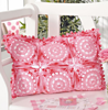 Six square motifs joined into pillow top with lace edging, in pink and shaded red / pink.