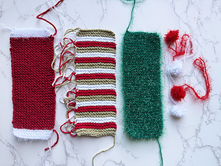 Scraps of white, red and green yarn.