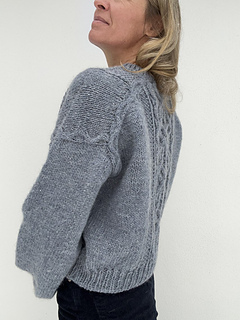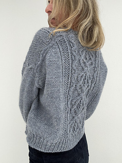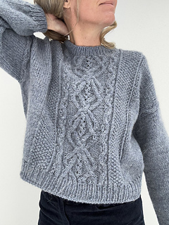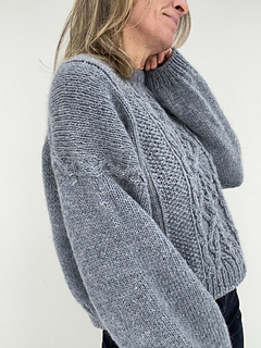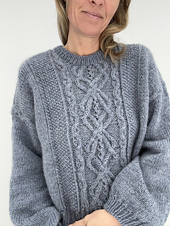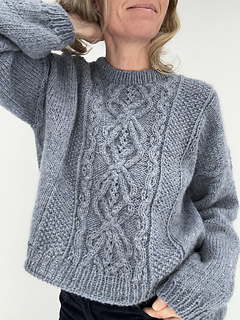 The KnittingByTheSea Sweater is a sweater featuring cables and textured stitch patterns. The sweater is worked top-down. At the beginning of the yoke, the back is worked first with cables, textured stitch patterns and increases. The front pieces are then worked separately, one at a time, with increases to shape the neckline. They are then joined to form the front, which is worked back and forth in cables and textured stitch patterns. The body is worked by joining the front and back and continuing in the round in cables and textured stitch patterns. The body is finished with a rib edge and a tubular Italian bind-off.Sleeves are picked up along the armholes and worked in the round in stockinette stitch, and finished with a rib edge and a tubular Italian bind-off. The neckband is worked by picking up stitches around the neckline, worked in rib in the round, and finished with a tubular Italian bind-off. The sweater is seamless.