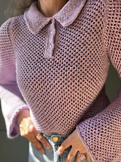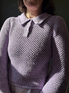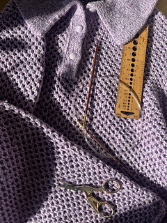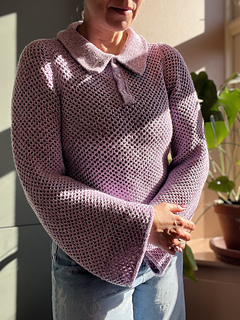 Kokomo Polo Blouse is a close-fitting, cropped model in a mesh pattern, with long sleeves and a polo collar. It is knitted from the top down. First, the work is knitted back and forth across the front and back pieces with increases around the shoulder stitches and towards the neck to form a sloping neckline at the front. When the shoulder seam has reached the correct length, the work is divided and the front and back pieces are worked separately. Plackets are added to the front pieces, which lead directly up into the collar, all worked in double knit. At the bottom of the front and back pieces, increases are made towards the armhole. The front and back pieces are joined and the body is worked in the round and finished with an i-cord. The sleeve is worked in the shape of a set-in sleeve, where you first knit back and forth across the top of the sleeve before joining in the round and finishing with an i-cord.
