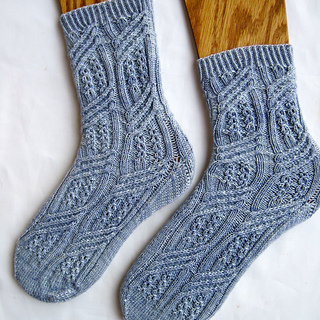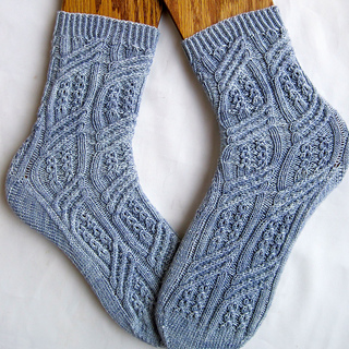 This pattern is for a pair of Japanese stitched socks. The sock incorporates both mock cables and traditional cables. There is small lace faggotting to allow for extra give,making them more comfortable: they will hug your ankle/leg without being too tight. There is small amount of lace work to increase the comfort. They are a fun knit making them a great finished pair of socks, for yourself or for a gift. The back and front are the same until the heel flap.