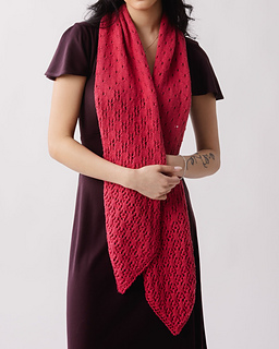 This beautiful scarf features a lace pattern that is denser on the ends and lighter in the middle. It starts out with a very lacy pattern and transitions into one with more stockinette between the lace then becomes a simple eyelet pattern for the middle section before reversing the process.