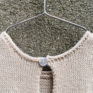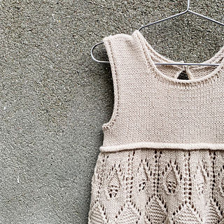 The skirt is worked in the round from the bottom up to the waist. Here, a welt is first worked across the front yoke before two i-cord ties are worked in the extension of the welt. Afterwards, front and back yoke are finished separately back and forth in stockinette stitch. The back has a little slit/keyhole opening that closes with a button. I-cord edges finish the neckline and armhole edges.