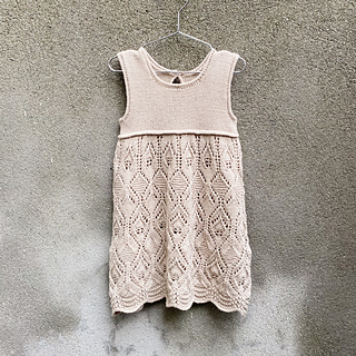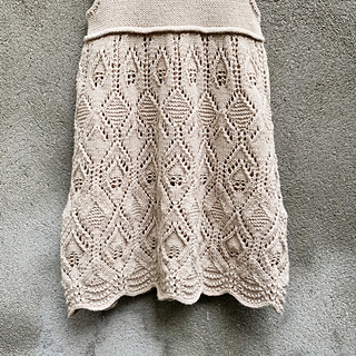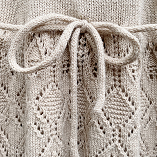 Lace Dress features a beautiful lace skirt and waist ties that are tied at the back. The dress is worked using 1 strand of either Merino, Cotton Merino or Pure Silk. The lace pattern is charted only.