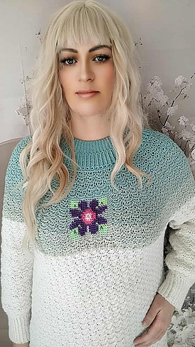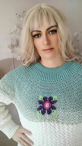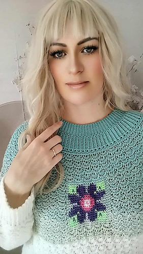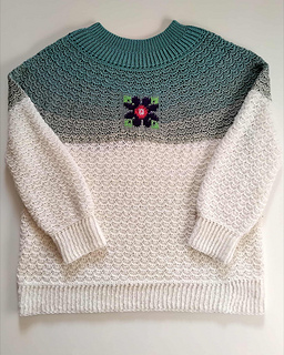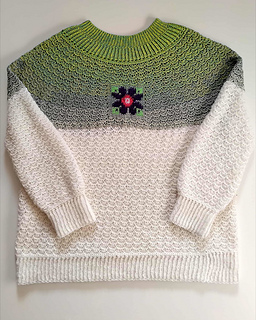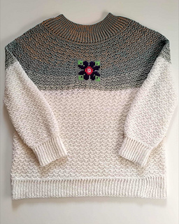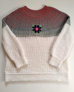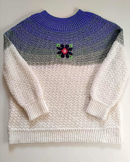 I used my 3 favorite ribbings, my favorite shell stitch with my favorite yarn together with a lovely floral mosaic. I am very satisfied with how this turned out and looking forward to applying the same recipe to create more beautiful, feminine garments.