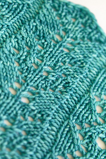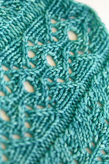 Basic stitches, single and multiple increases, decreases. Relatively easy to memorize stitch pattern. Easy patterning on all rounds. Lace patterning on odd rounds only. Elastic BO.