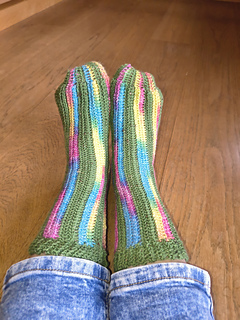 These socks come in one size fit all since they are constructed in a very simple and linear way.