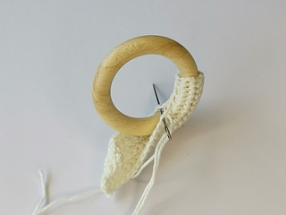 - Houten ring met een doorsnede van 5,5 cm. U kunt ook andere maten gebruiken. Er is een omschrijving hoe u het lapje voor de ring moet haken en bevestigen.