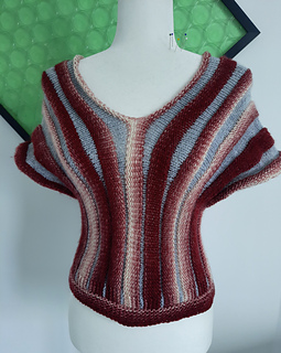 The Lana Blouse is a side to side pattern worked all at once. Imagine you are working a long rectangle and the sides are sewn. The neckline is a bind-off/cast-on rows in the middle and it is tied on the back with I-cord or a bow. It is pretty much a rectangle with a hole in the middle. The textures formed by the Purl stripes on the Wrong Side make it a ver modern and contemporary fit.