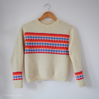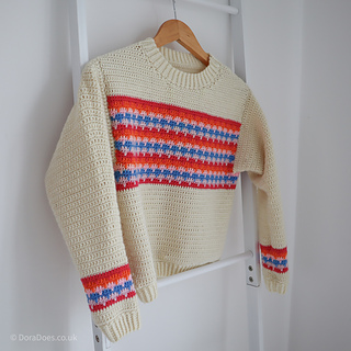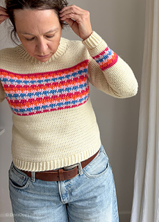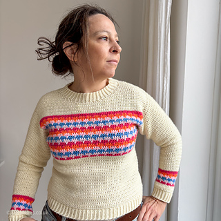 The Lark Sweater is a bottom-up, modified drop crochet jumper with a round, crew neck and fun colour-work pattern across the chest which is mirrored on the sleeves.