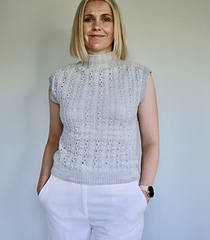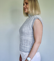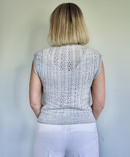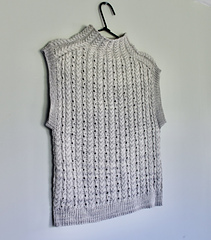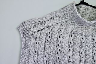 Loose fitted with bottle neck. The cables and lace makes it breezy enough for summer, but it’s also a nice layer of wool close to the body to help hold the body temperature stable.