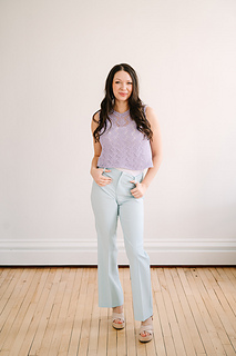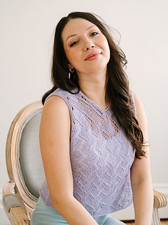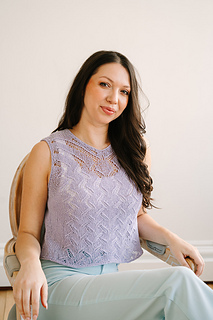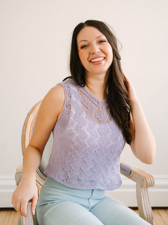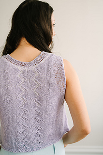 This lavender summer top starts at the back with slim straps, then flows seamlessly into a lace-shaped front before joining to knit in the round for an easy, flattering fit. Finished with clean neckline detailing and soft I-cord arm edges, it’s a light, polished piece you’ll love wearing all summer long.