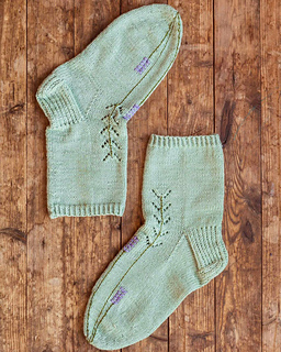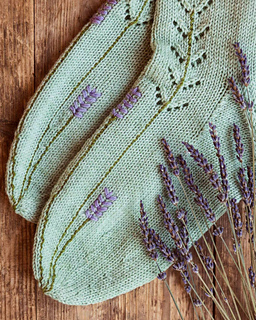 Riikka Hällmark suunnitteli Laventeli-sukat, joita koristavat kauniin pitsikuvion lisäksi sukkiin jälkikäteen kirjottavat laventelin varret ja kukinnot. Sukat neulotaan varresta varpaisiin, ja kirjotut kuviot voit tehdä myös eripaksuisilla ja -sävyisillä jämälangoilla.