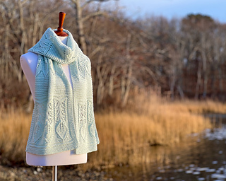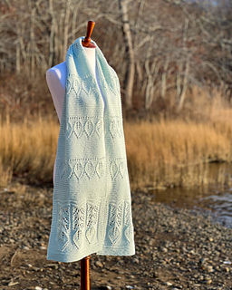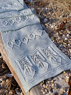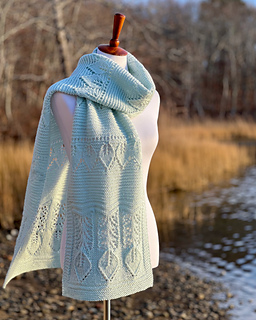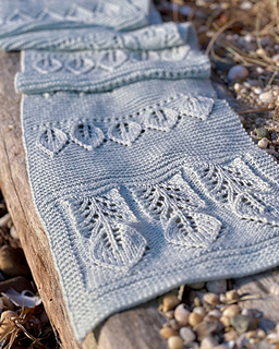 Knitted in DK-weight yarn, this design features bands of leafy lace and eyelets set within a field of relaxing garter stitch. The scarf begins at the center, with both sides worked outward so that the ends match perfectly, and each end is finished with a beautiful border of leafy sprigs.