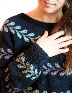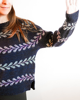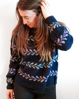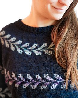 The Leafy Lane Sweater is a DK-weight, top-down pullover, worked seamlessly with bands of leafy stranded colorwork encircling the yoke, body, and sleeves. The leaves appear at regular intervals, separated by wide stretches of the main color, creating a chic sweater that is both fun and easy to knit, yet simple and comfortable to wear. A neat double collar and split hems add structure and comfort. Available in ten inclusive sizes from 37.75 to 68.25 inches at the bust, and designed to be worn with 3–8 inches of ease, the Leafy Lane Sweater is the perfect blend of relaxed coziness and pretty colorwork.