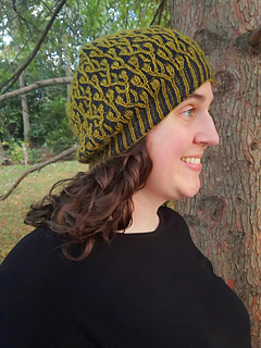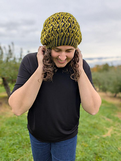 Instructions are provided in written and charted form. Video tutorials are linked in the pattern for brioche increases, decreases, and cables. Instructions are provided to add or subtract repeats to the length of the hat to create a slouchier fit or a more traditional beanie fit.