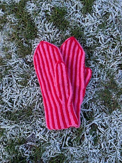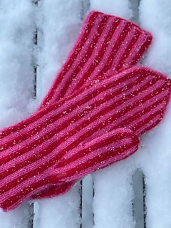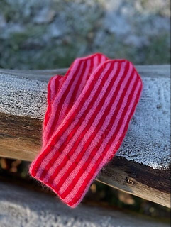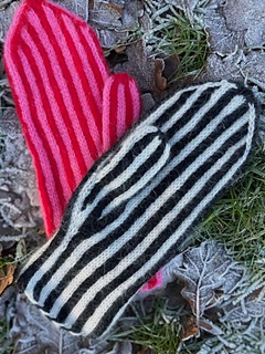 The mittens are worked in the round from the wrist toward the fingers. They are knitted using the magic loop method, but can of course be worked on double-pointed needles if preferred. Begin with a two-color ribbed cuff. Continue following the chart across the hand, where stitches are set aside for the thumb and a thumb gusset is worked. After completing the thumb gusset, a piece of scrap yarn is knitted into the work, then continue according to the chart to the top of the mitten. Finally, stitches are picked up for the thumb, placed on the needle, and the thumb is finished.