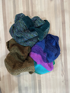 Contrasting Colors (CC1-5): 400 yds of fingering weight yarn in various colors. If using mini-skeins, this is about five mini skeins, approximately 80 yds each
