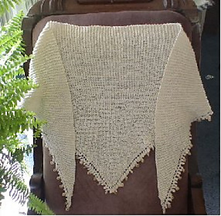 This shawl pattern is knitted in the garter stitch (knit every row) with a simply elegant picot edge. You may use any yarn of your choosing in any gauge. The size is all up to you, a short neckerchief or a long wraparound, you and your needles decide!