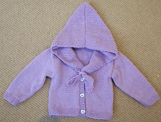 Baby cardigan knit flat in pieces and seamed to finish.