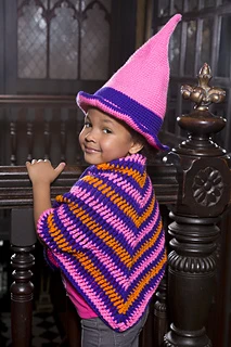 Crochet a hat and shawl for your charming mini witch! Customize the look by using her favorite colors, which we’re betting are pink and purple.