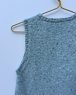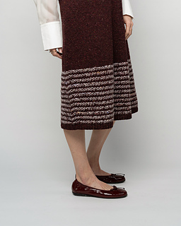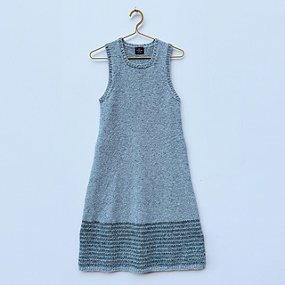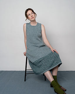 Livø Dress is worked top down in stocking stitch with a slip-stitch pattern at the bottom of the skirt. The hems are worked in rib. First the upper part of the back is worked, then the upper part of the front sections which are then joined and worked down to the underarms, after which the sections are joined. The body and skirt are worked in the round with increases and slip stitch pattern.