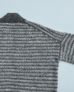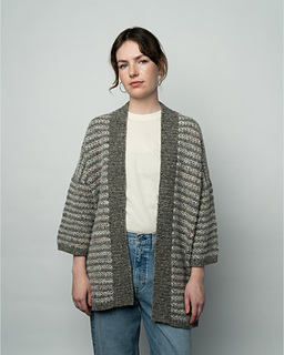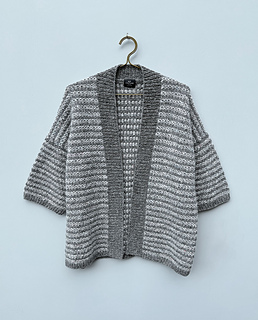 Livø Kimono is worked from the top down in a slip-stitch pattern and with a European shoulder. First the upper part of the back is worked, then the upper part of the front sections down to the underarms, after which the sections are joined. The body is worked back and forth. The sleeves are worked top down to three-quarter length. Finally, stitches are picked up to work the wide front edges.