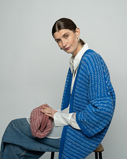 Livø Kimono features an elegant design with an oversized fit, making it suitable for both indoor and outdoor wear. Livø is knitted in slip-stitch pattern, creating a beautiful textured look – and it’s a fun technique to work with. The kimono is knitted in Tweed and Blow, which together create a rich and vibrant play of colours.