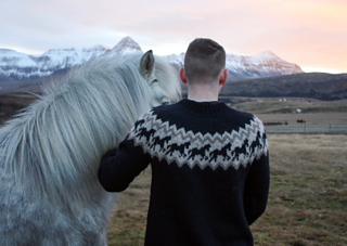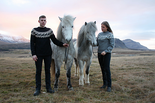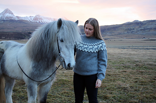 Ljómi is the perfect sweater for horse lovers. The sweater is knitted in the round with stockinette stitch and stranded knitting horse pattern on the yoke. The ribbings at the bottom of the body, sleeves and the collar are knitted; k 1 st, p 1 st, repeat.