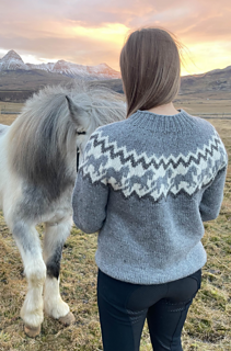 Bolur og ermar eru einlit en berustykkið er prjónað með tvíbanda hestamunstri.