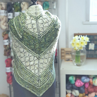 24 stitches and 33 rows to 10 cm (4”) in stocking stitch knitted flat using the smaller needles. Gauge is not critical for this project, but a different gauge will affect the final size of the shawl and the yardage requirements