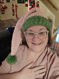 Hat is worked from the peak toward the brim in one piece. Pompom and holly leaf motif made separately.
