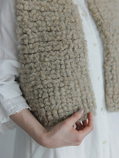 かぎ針で鎖3目の引き抜きピコットを細編みに編むことでボアのような厚みのあるモコモコとした質感の編み地に仕上がります。